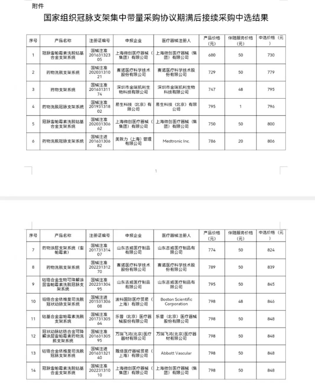 国家组织高值医用耗材联合采购办公室日前发布的中选结果显示,微创医疗、赛诺医疗、美敦力等10家企业的14个产品中标,平均中标价格770元,加上伴随服务费,终端价格区间在730元至848元。
