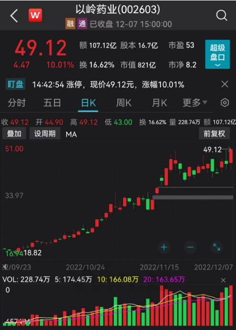 被称为“石家庄茅台”的以岭药业,今日再度涨停并创历史新高,最新报49.12元/股,市值突破800亿元。