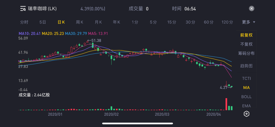 此消息一出,引起轩然大波。瑞幸咖啡4月2日开盘暴跌,盘中八次触发熔断暂停交易,股价从前一日的26.10美元/股暴跌至 4.91美元/股,停牌前的最后一个交易日(4月6日)收于4.39美元/股。而在2020年初时,瑞幸咖啡股价一度达到51.38美元/股。