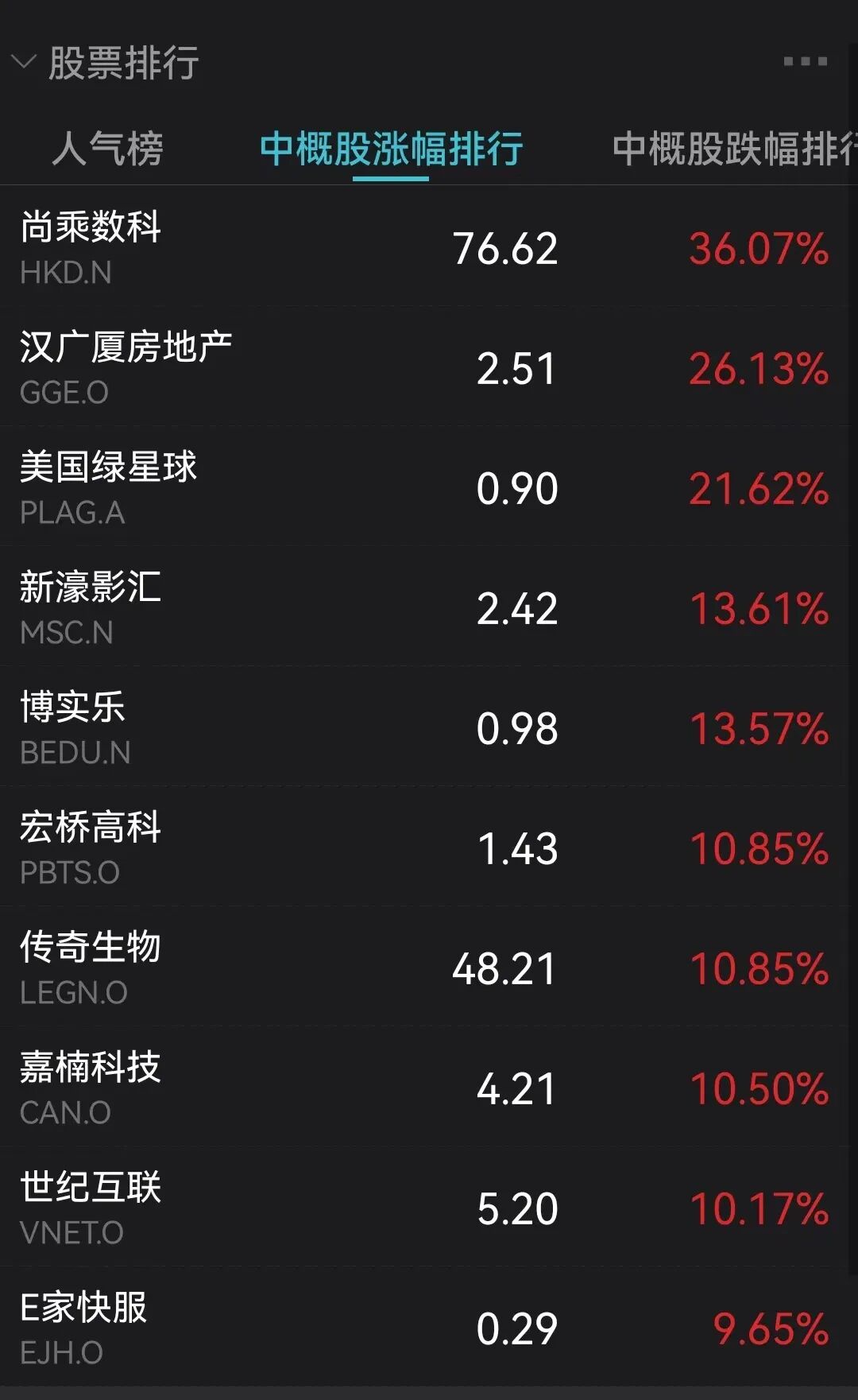 科技股大涨,亚马逊涨5.37%,奈飞涨6%,谷歌涨7.66%,Meta涨6.55%。热门中概股多数上涨,尚乘数科涨36.07%,新濠影汇涨13.61%,传奇生物涨10.85%,宏桥高科涨10.85%,嘉楠科技涨10.5%;亘喜生物跌17.34%,团车跌13.87%。中概新能源汽车股集体上涨,蔚来汽车涨1.68%,小鹏汽车涨1.93%,理想汽车涨0.39%。![]()