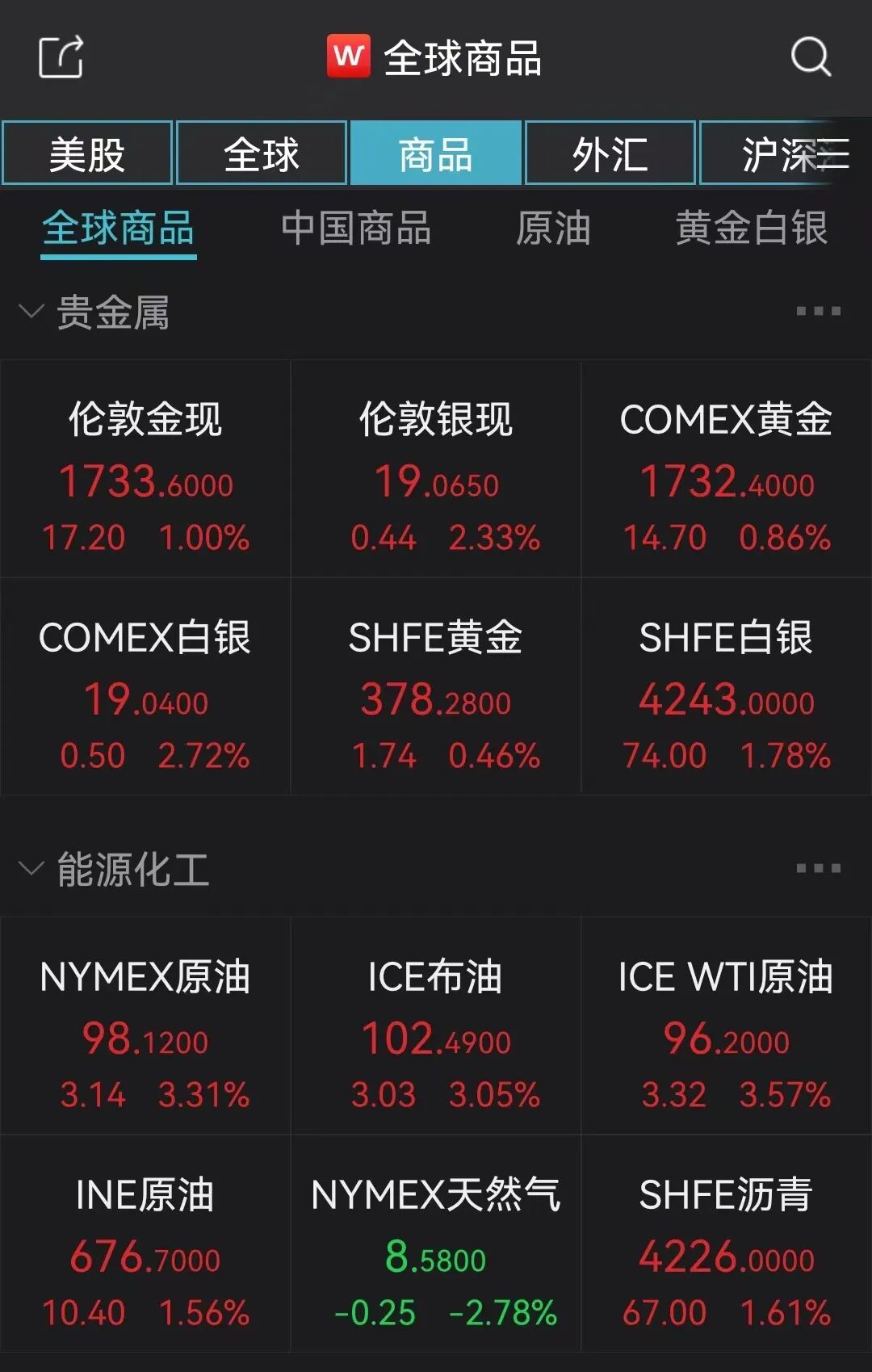 国际油价集体上涨,美油9月合约涨3.31%报98.12美元/桶,布油10月合约涨3.05%报102.49美元/桶。![]()