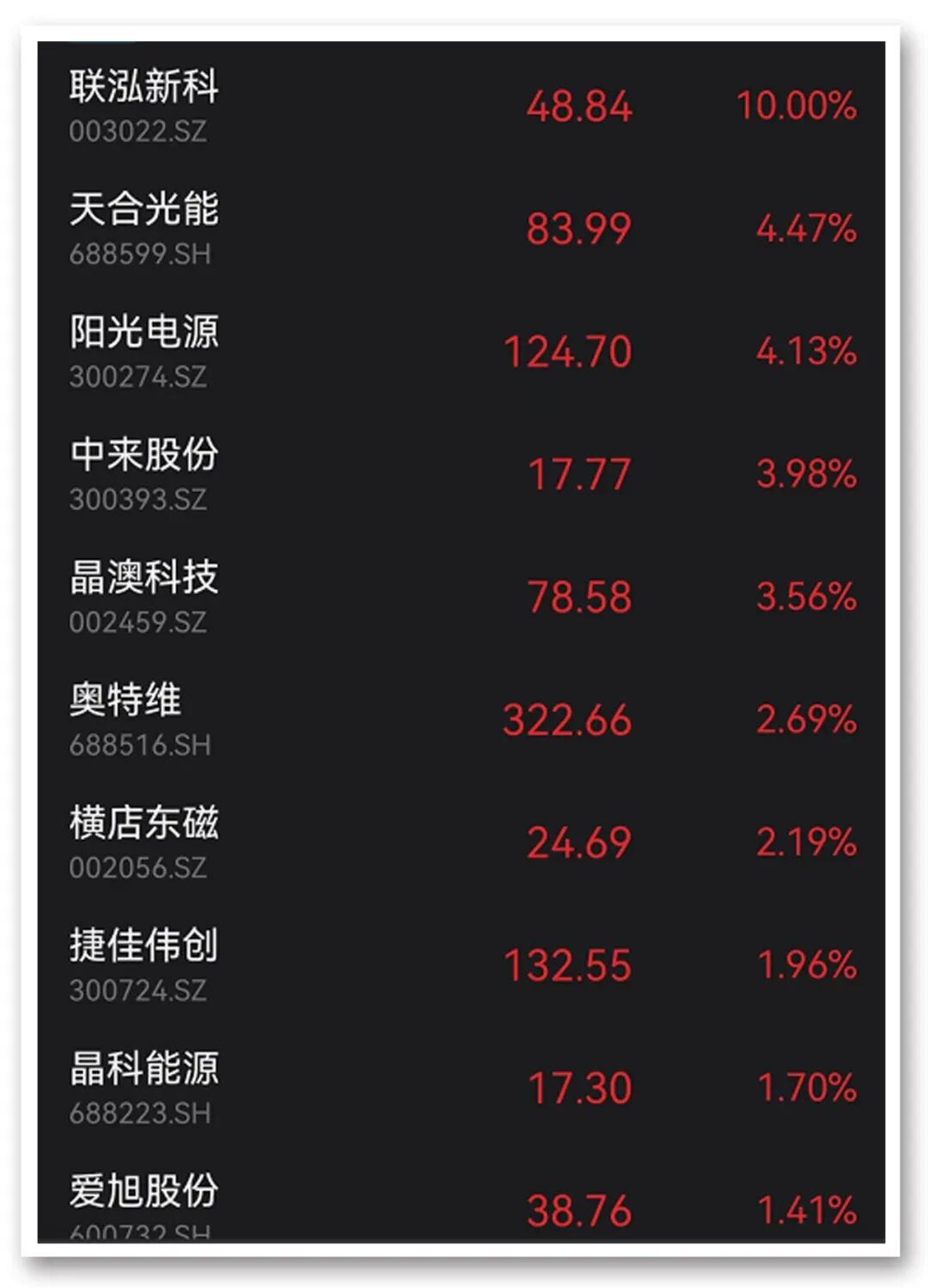 光伏概念股今日再度活跃,联泓新科两连板,天合光能、阳光电源涨逾4%,中来股份、晶澳科技等涨超3%,横店东磁、晶科能源纷纷跟涨。