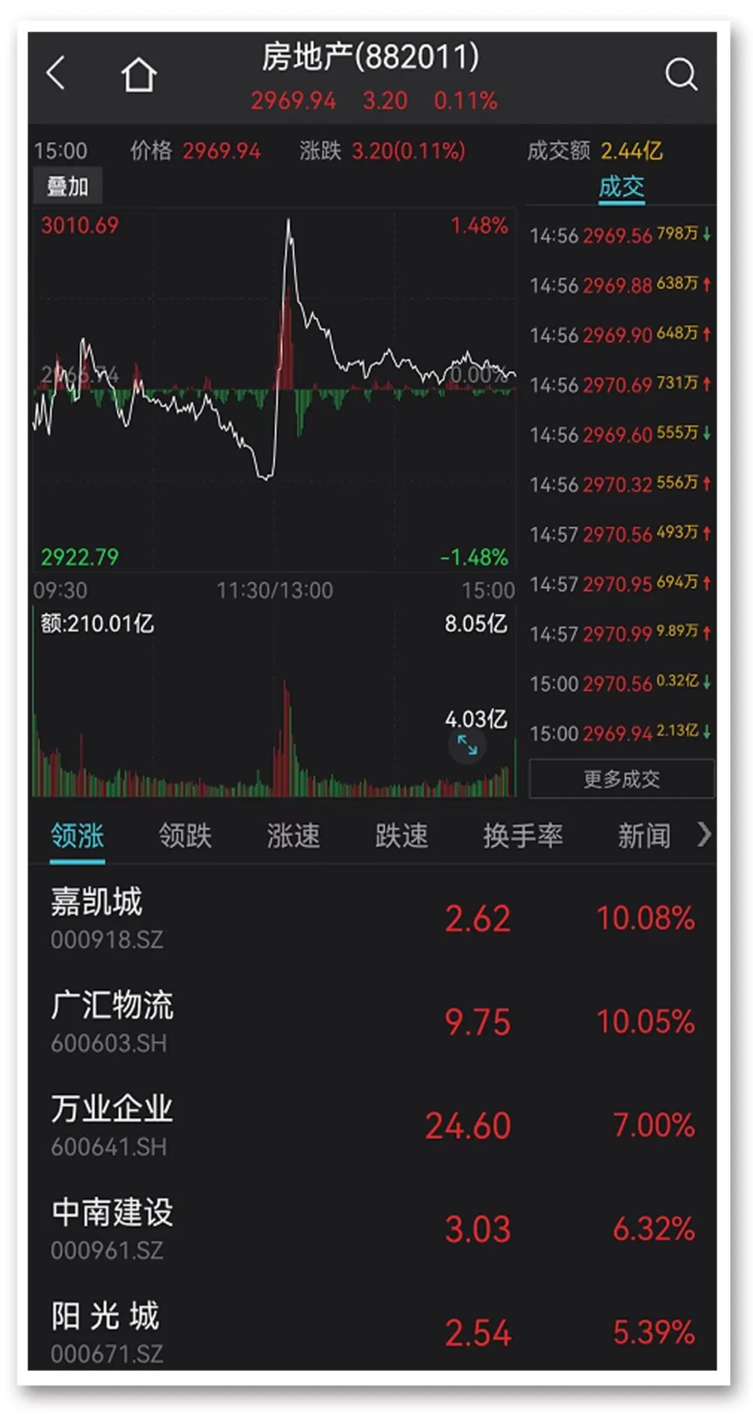 午后开盘,房地产板块突然直线拉升,Wind房地产指数瞬间拉涨逾2%,随后有所回落。截至收盘,嘉凯城、广汇物流涨停,万业企业涨7%,中南建设、阳光城涨逾5%,万通发展、华发股份、中交地产、新城控股、荣盛发展等跟涨。