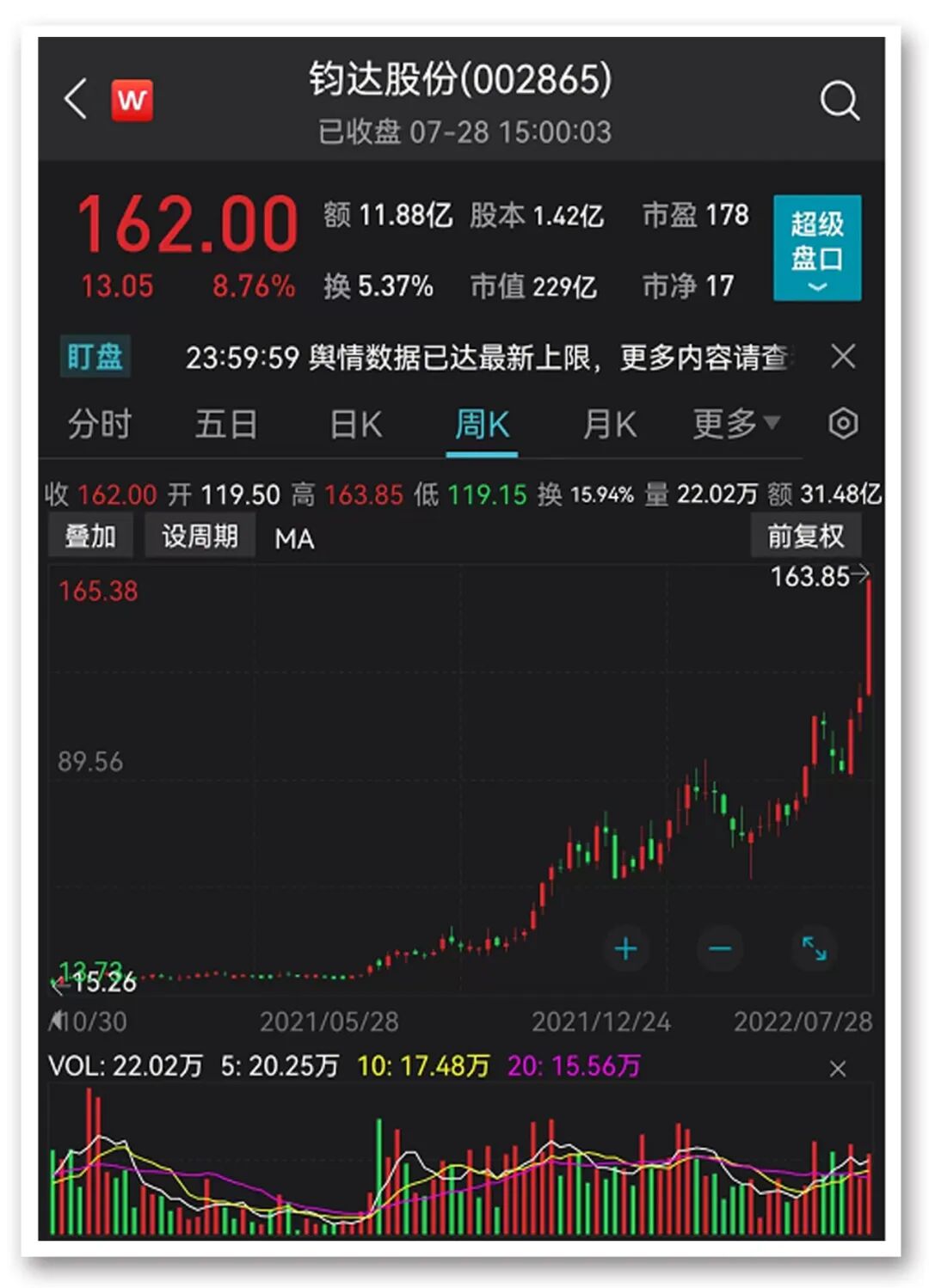 值得一提的是,钧达股份今日虽然没能封住涨停板,收盘“仅”大涨8.76%,报162元/股,但在近一年半涨幅已超过10倍。