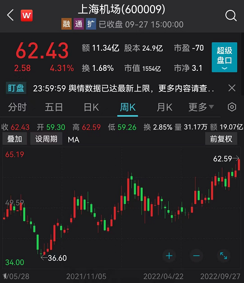 值得一提的是,市值超过1500亿元的“机场茅”上海机场,今日上涨4.31%,收报62.43元/股,再创一年半以来的新高。