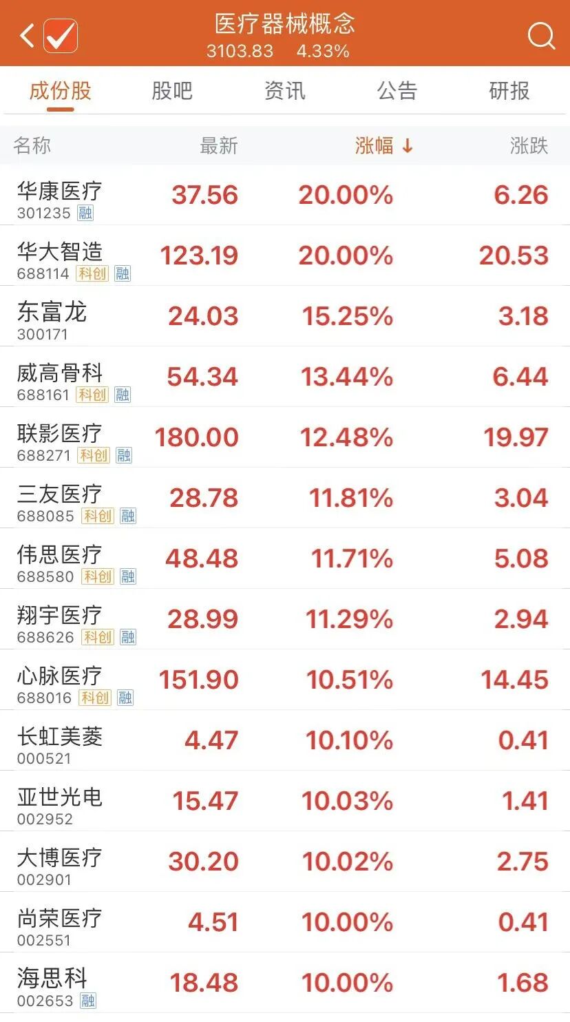 二级市场的相关概念股在拟中选结果尚未公布之前就已纷纷大涨。截至27日下午收盘,威高骨科、三友医疗涨幅超10%,大博医疗涨停。另外,凯利泰涨超7%,春立医疗涨超4%。在其带动下,整个医疗器械板块集体大涨,其中,华康医疗、华大智造“20CM”涨停。