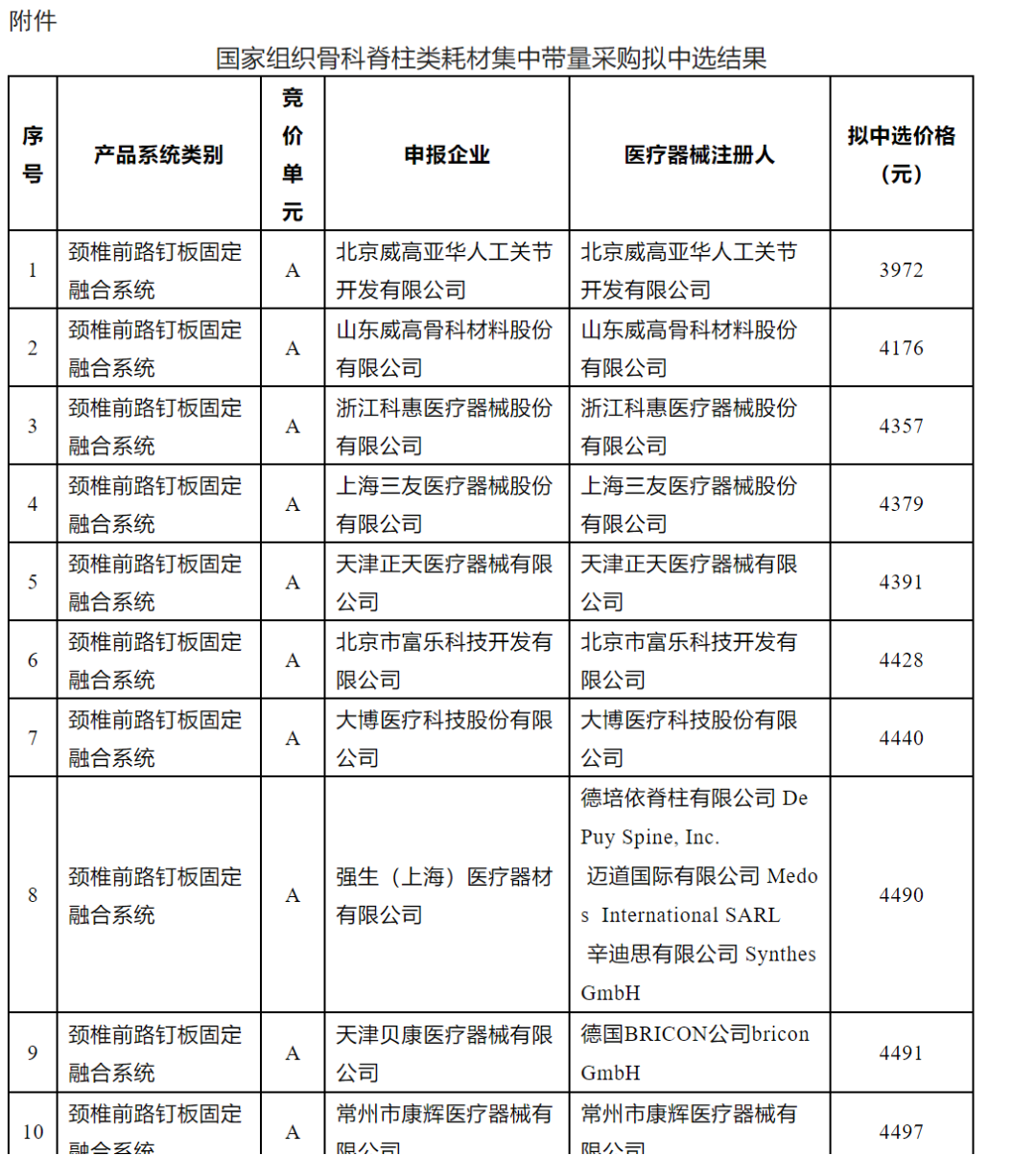 此次集采根据颈椎、胸腰椎手术的需要,覆盖颈椎固定融合术、胸腰椎固定融合术、椎体成形术、内窥镜下髓核摘除术、人工椎间盘置换术5种骨科脊柱类耗材形成14个产品系统类别。首年意向采购量共109万套,占全国医疗机构总需求量的90%,涉及市场规模约310亿元。从拟中选名单来看,威高骨科、大博医疗、三友医疗、迈瑞医疗等国产医疗器械企业均在中标之列。