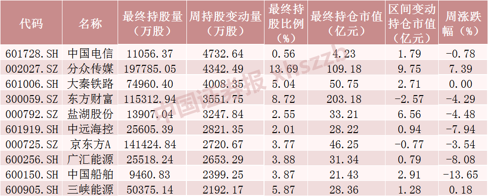 从市场表现情况来看,上周北向资金持股增加数前十的股票中,除分众传媒、三峡能源分别上涨7.39%、0.18%,大秦铁路收平外,其他股票均下跌,其中中国船舶跌幅最大,下跌13.65%。