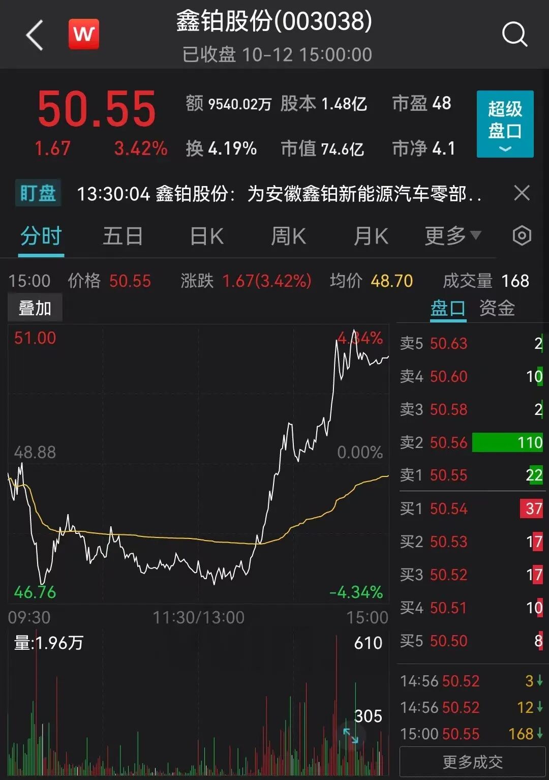 10月12日,鑫铂股份股价上涨3.42%,收报50.55元/股,市值74.6亿元。
