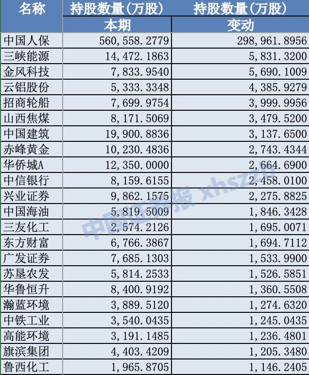 其中,获增持超过1000万股的公司有22家,包括中国人保、三峡能源、金风科技、云铝股份、招商轮船、山西焦煤、中国建筑、赤峰黄金、华侨城A、中信银行等。