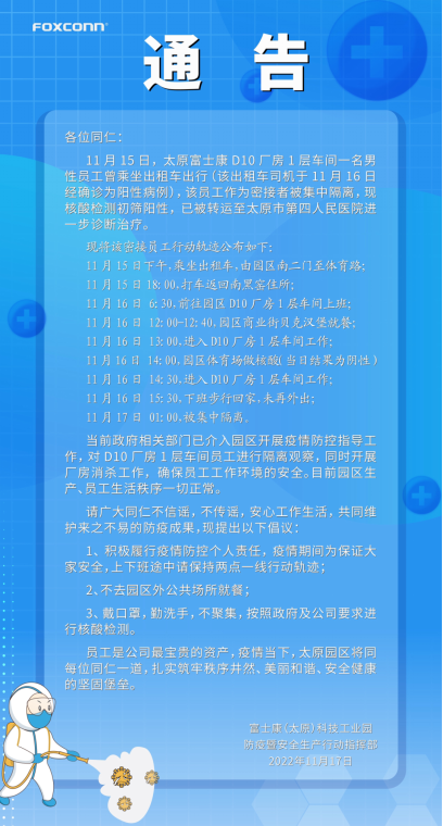 据羊城晚报11月18日报道,11月17日,网上流传“18日起天河区全面取消堂食”的截图。据此,记者向天河区相关部门求证,此为不实消息。与此同时,记者了解到,天河区天河南街疫情防控指挥部办公室发布通告:天河村内所有餐饮服务单位(含饮品店、小吃店、早餐店等)暂停堂食,只提供到店自取、网络或电话等外卖订餐服务。堂食恢复时间根据疫情形势变化和政策动态调整。11月18日凌晨,富士康太原科技工业园发布通告,太原富士康一男性员工核酸初筛阳性。15日,该名员工乘坐出租车出行,出租车司机于16日被诊断为阳性。此后,该员工作为密接者被集中隔离,经核酸检测初筛阳性。该员工15日至16日的轨迹显示,其曾到富士康太原园区上班、就餐。目前该员工所在车间的员工已被隔离。园区生产、员工生活秩序一切正常。据太原疫情防控办通告,截至17日18时,太原市本轮疫情已发现307人感染。11月18日,中国工程院院士张伯礼在经济日报撰文称,国务院联防联控机制近日发布《关于进一步优化新冠肺炎疫情防控措施 科学精准做好防控工作的通知》,提出了进一步优化防控工作的二十条措施。这些措施非常及时、非常必要,对于实现“疫情要防住、经济要稳住、发展要安全”的目标,保障经济社会发展兼顾群众生活需求将起到重要作用。文章称,我们应该充分认识到,优化调整防控措施不是放松防控,更不是“放开”“躺平”,而是要在最大程度保护人民生命安全和身体健康的基础上,探索高效统筹疫情防控和经济社会发展的最优解。当前,我国疫情防控还面临复杂性、艰巨性、反复性的严峻形势,受病毒变异和冬春季气候因素影响,疫情传播范围和规模有可能进一步扩大。只有进一步提升防控的科学性、精准性,才能在统筹疫情防控和经济社会发展间寻求最佳平衡点。