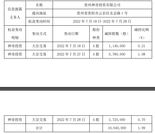 神奇制药7月28日发布公告称,第一大股东神奇投资于2022年7月18日至2022年7月28日通过大宗交易方式累计减持公司股份10640000股,占公司总股本的1.99%。中国证券报·中证金牛座记者查阅神奇制药大宗交易发现,在7月18日大宗交易的114万股折价12.02%,成交价为5.27元/股,之后在7月27日大宗交易的578万股和7月28日大宗交易的372万股成交价均为6.05元/股,合计减持金额为6375.28万元。而今,神奇投资减持的1064万股的市值为1亿多元。