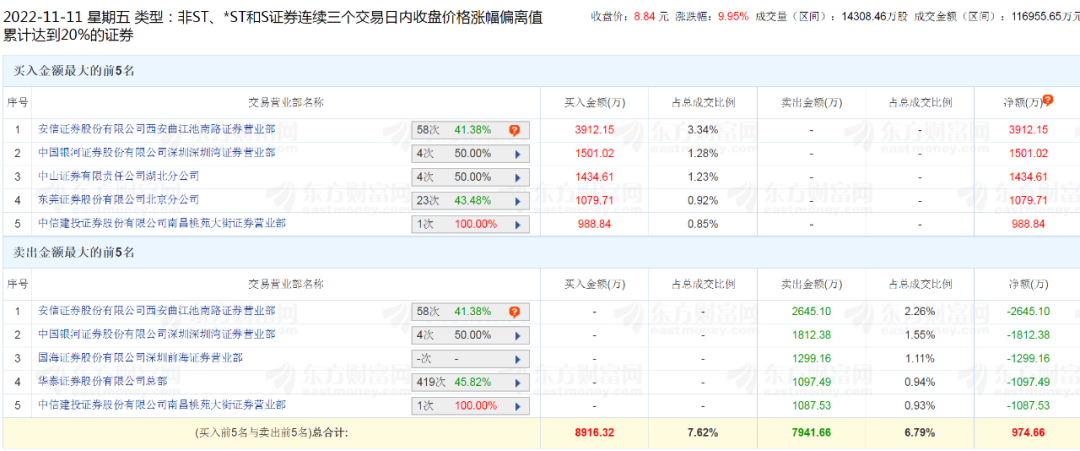 在神奇制药“六连板”期间,神奇制药三度登上龙虎榜,从神奇制药近几日的龙虎榜情况来看,在11月11日的3日龙虎榜中,买一席位的安信证券西安曲江池南路证券营业部买入超3900万元,卖出超2600万元;买二席位的银河证券深圳深圳湾证券营业部买入超1500万元,卖出超1800万元。