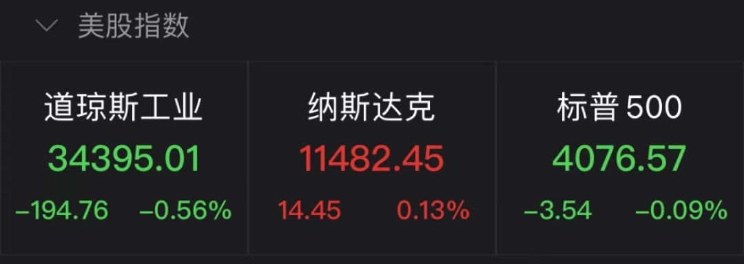 当地时间12月1日,美股三大股指涨跌互现。截至收盘,道指跌0.56%报34395.01点,标普500指数跌0.09%报4076.57点,纳指涨0.13%报11482.45点。