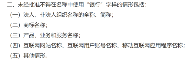 根据《通知》,未经银保监会及其派出机构批准,任何法人、非法人组织不得在名称中使用“银行”字样,国际金融组织、中央银行、多边开发机构与国家另有规定的除外。自然人(包括个体工商户)不得以营利性为目的或者以可能误导公众的方式在名称中使用“银行”字样,法律另有规定的除外。