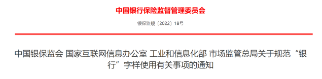 银保监会网站12月2日消息,中国银保监会、国家互联网信息办公室、工业和信息化部、市场监管总局近日联合发布《关于规范“银行”字样使用有关事项的通知》(以下简称《通知》),进一步规范“银行”字样的使用。