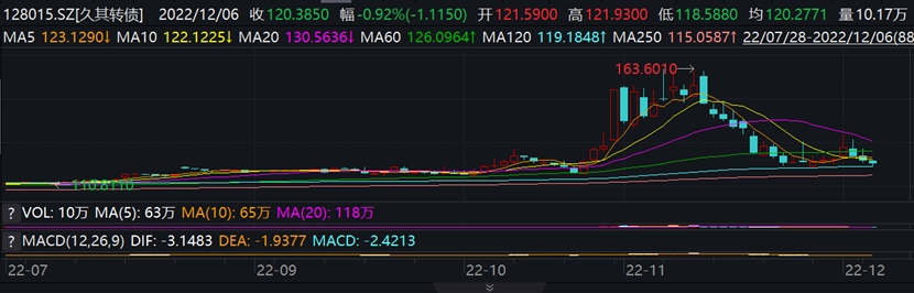 今天(12月6日)是久其转债最后交易日,截至6日上午收盘,久其转债收盘价为120.39元,与提前赎回价格有一定差距,如果投资者不及时转股或卖出,可能亏损16%。