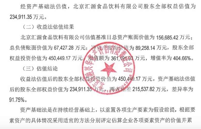 根据北京国融兴华资产评估有限公司2022年11月11日出具的估值报告,北京汇源收益法估值后的股东全部权益投资价值为450449.17万元,资产基础法估值后的股东全部权益价值为234911.35万元,两者相差215537.82万元,差异率为91.75%。