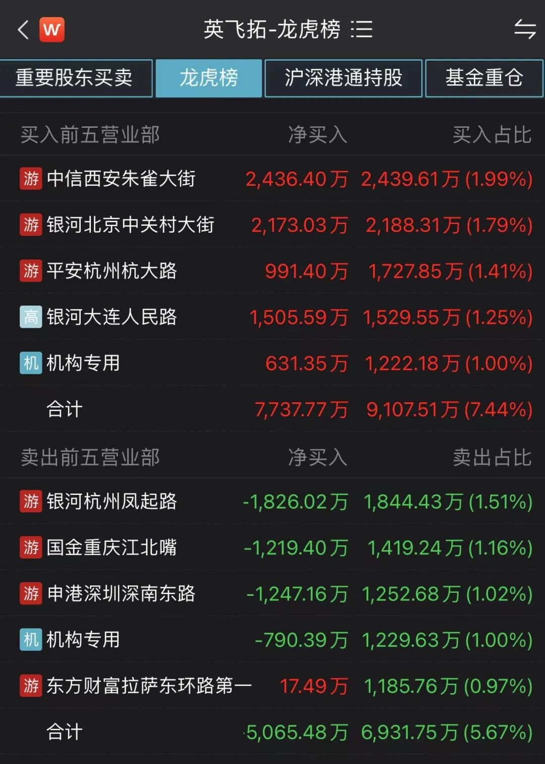 1月5日,受业绩预告爆雷影响,英飞拓股价跌停。盘后龙虎榜显示,买五席位中,中信西安朱雀大街营业部、银河北京中关村大街营业部、平安杭州杭大路营业部均为游资席位。