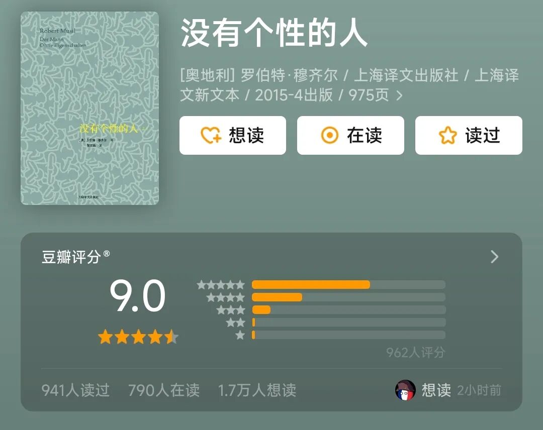 《没有个性的人》是穆齐尔未完成的遗作,一部“精神长篇小说”,在二十世纪现代派文学中具有重要地位。一九九九年,应德国贝塔斯曼文学家出版社和慕尼黑文学之家的要求,有作家、评论家和德语语言文学专家各三十三名组成的评委会评出了一份二十世纪最重要的德语长篇小说名单,位居榜首的就是《没有个性的人》。小说的背景是1914年前的奥匈帝国。在维也纳,人们成立了一个委员会,筹备1918年庆祝奥皇弗兰茨•约瑟夫在位70周年的活动;在这同一年,德国将庆祝德皇威廉二世在位30周年。所以,人们称奥地利的这个行动为“平行行动”(然而,1918年正好将是这两个王国覆灭的年份,这将一个滑稽荒唐的炸弹放进小说的基底)。小说的主人公——平行行动委员会秘书乌尔里希——在故事开始时32岁,他认识到,对自己来说,可能性比中庸的、死板的现实性更重要;他觉得自己是个没有个性的人,因为他不再把人,而是把物质看作现代现实的中心:“今天……已经产生了一个无人的个性的世界,一个无经历者的经历的世界;他看到自己被迫面对时代的种种问题,面对理性和心灵、科学信仰和文化悲观主义之间的种种矛盾。另外,小说还描绘了主人公在平行行动的活动圈里接触到的行动负责人狄奥蒂玛、金融巨头和“大作家”阿恩海姆、年轻时代的朋友瓦尔特和克拉丽瑟、神经错乱的杀人犯莫斯布鲁格尔、同他一起经历乱伦的爱的胞妹阿加特等等。