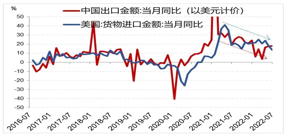 美联储强势加息压低通胀,同时对需求造成影响,美国进口增速回落。中国出口到美国货值占总出口金额16%左右,美国需求下行将影响中国出口增速。