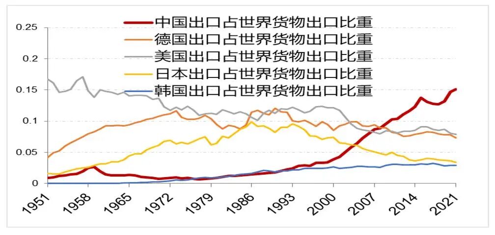 中国依赖劳动力成本优势,出口创汇,形成外汇占款与银行资本金,银行寻找地产基建作为扩信用抓手,形成GDP增速与就业,通过“出口创汇-地产基建”双循环模式推动了中国经济过去二十年快速发展,同时推动中国出口占世界货物出口份额的持续提升(下图)。
