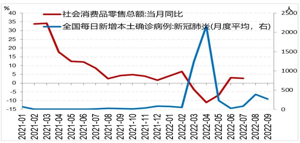 图:全国社零增速与全国新增本土确诊病例明显负相关