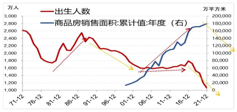 图:1990-2000年出生下降,对应2016-2026年出生下降,买房需求下降 (黄线)