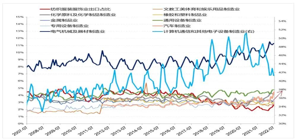 从趋势上来看,汽车制造业、化学原料及化学制品制造业2022年来出口占比上行比较明显。电气机械及器材制造业2018年来整体都在上行。