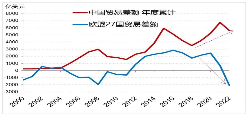 作为全球门类最全的制造业强国,“中国制造”将替代欧洲日韩在全球竞争中占有一席之地——2022年来中国贸易顺差和欧盟贸易逆差形成较大反差(下图)。