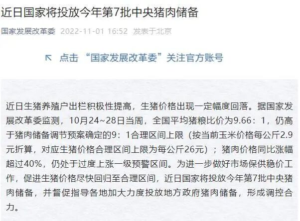 新牧点评:在持续的放储下,近期猪价有所回落,政府调控的决心还是很坚决的。