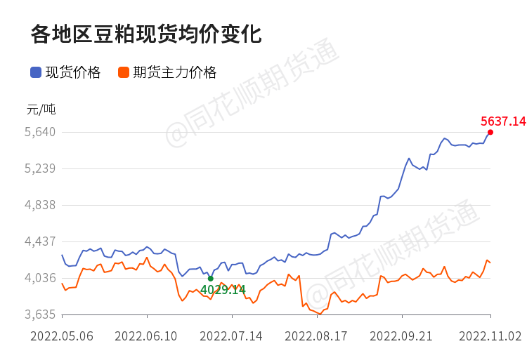 11月2日,豆粕现货均价5643元/吨,局地冲至5840元/吨。11月3日,豆粕现货价格小幅回落,但仍处在5600元/吨的高位。受原料上涨的影响,帝斯曼宣布自11月1日对维生素产品调价。双胞胎、海大、瑞孚、斯特佳等多家饲企再度涨价。