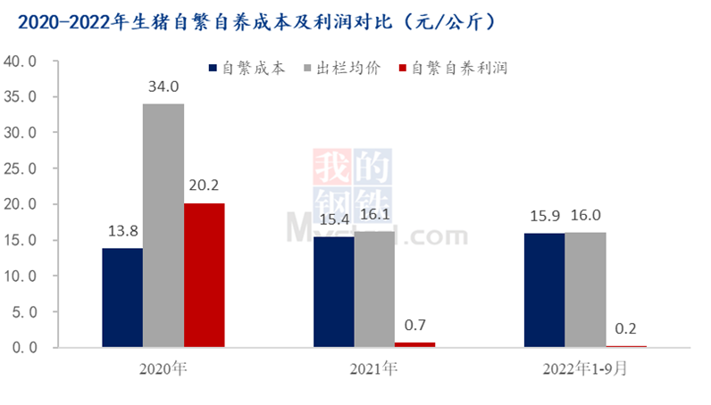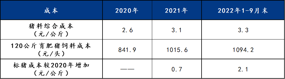 测算饲用成本,2022年前三季度较2021年单独饲料成本高出0.7元/公斤,较2020年饲用成本高出2.1元/公斤,饲用成本攀高之快,对养殖端无形中形成较大压力,但对于新一轮周期的上行也形成强烈情绪性助推。