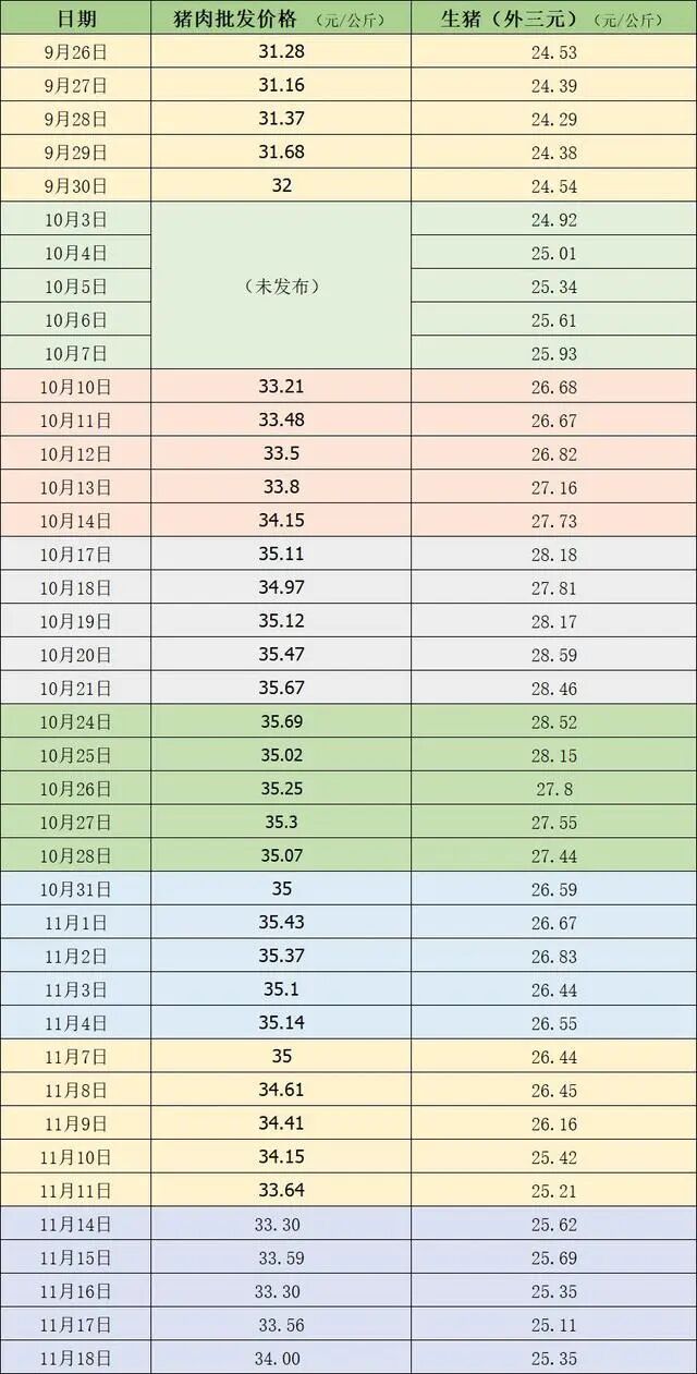 11月16日,国家发展改革委召开11月例行新闻发布会,新闻发言人孟玮表示,今后一段时间,虽然猪肉市场仍处于消费旺季,但国内能繁母猪、新生仔猪、育肥猪存栏量均已连续多月回升,市场供应会相应增加;特别是监测到,近日养殖户出栏节奏趋于正常,前期压栏和二次育肥的生猪也已开始陆续出栏,这将进一步增加市场供应。