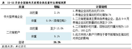综合考虑中大型养殖企业生猪出栏计划增幅、散养户二次育肥猪源出栏数量及重量增幅,预估11-12月猪肉月度理论供应量较8-10月平均供应量或超过26%,详细数据见下表。