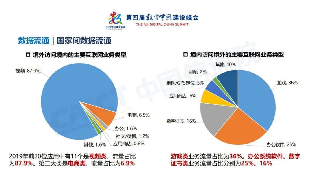 从境外访问我国境内的互联网业务类型看,2019年前20位应用中有11个是视频类,流量占比为87.9%。第二大类是电商类,流量占比为6.9%。从境内访问境外的互联网业务类型看,游戏类业务流量占比为36%。办公系统软件、数字证书类业务紧随其后,流量占比分别为25%、16%。