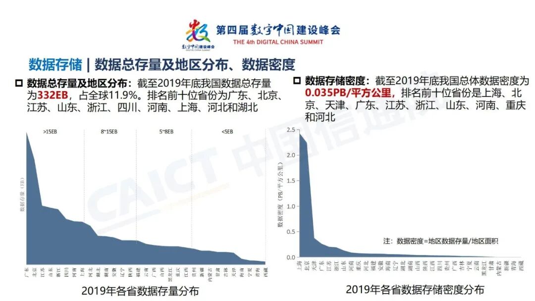 截至2019年底,我国数据总存量约为332EB,占全球总存量(约2800EB)的11.9%。从数据存储的区域分布看,截至2019年底,全国数据存量排名前十位的省份为广东、北京、江苏、山东、浙江、四川、河南、上海、河北和湖北。从数据存储密度看,截至2019年底我国总体数据密度为0.035PB/平方公里,排名前十位的省份是上海、北京、天津、广东、江苏、浙江、山东、河南、重庆和河北。人均数据存量方面,截至2019年底,我国人均数据存量为255.4GB。