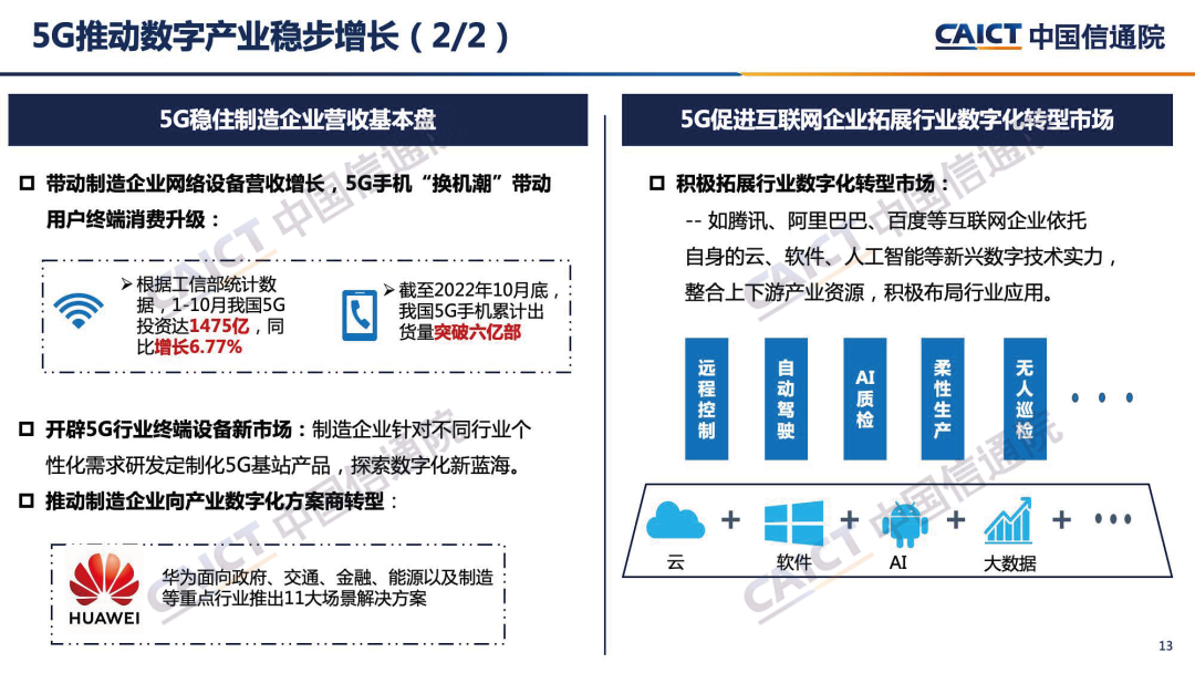 3. 5G推动数字产业稳步增长。5G推动运营企业信息服务业务持续增长,2022年1-11月份,三家基础电信企业完成移动数据流量业务收入5882亿元,同比增长0.5%,在电信业务收入中占比为40.6%,拉动电信业务收入增长0.2个百分点。5G带动网络设备营收增长、消费级终端设备迭代升级,稳住制造企业营收基本盘,同时推动制造企业构建端到端5G应用解决方案供给能力,向产业数字化转型方案商转型。