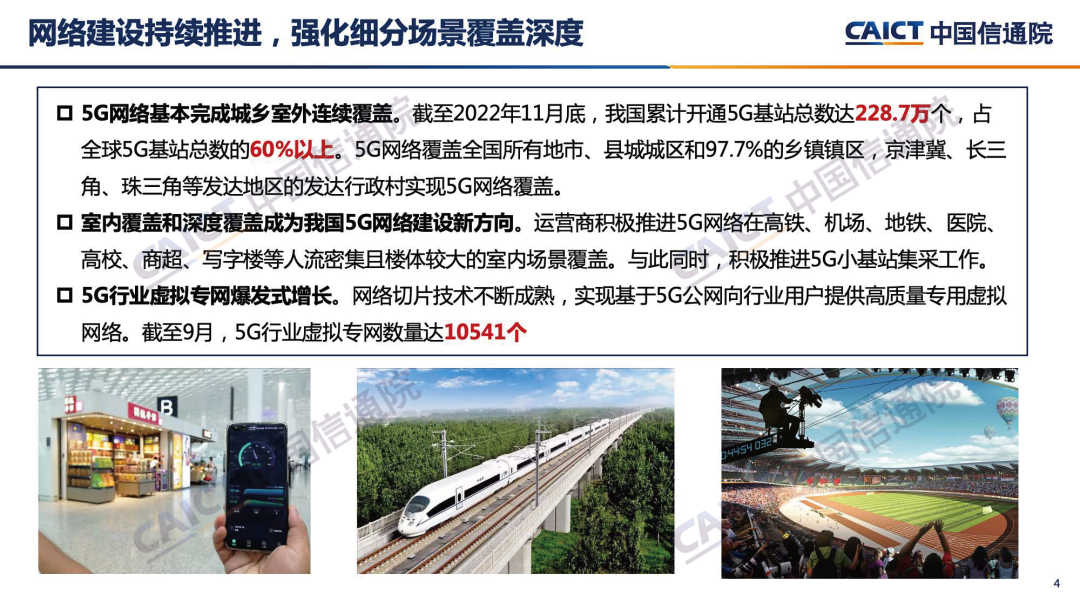 2. 我国5G发展渐入佳境。我国5G网络基本完成城乡室外连续覆盖,截至2022年11月底,我国累计开通5G基站总数达228.7万个,占全球5G基站总数的60%以上。我国5G个人用户规模持续扩大、用户渗透率突破三成,截至2022年11月底,我国5G用户渗透率达32.2%,较2021年末提升10.6个百分点,5G移动电话用户达5.42亿户。我国5G行业应用向纵深发展,5G与不同行业应用呈梯次渗透特征。