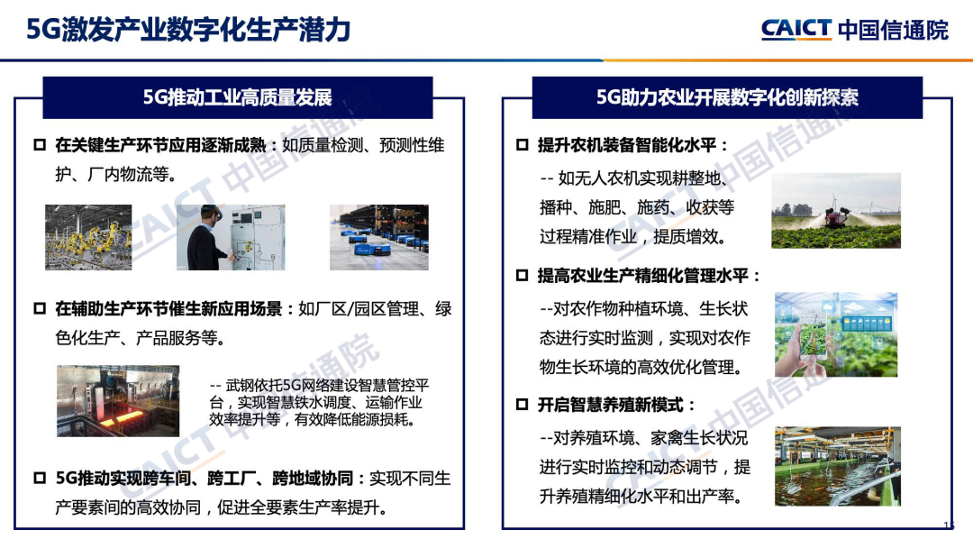 4. 5G激发产业数字化活力。5G与人工智能、大数据、云计算等数字技术相结合,不断探索在工业、农业、商业、社会治理、公共服务以及文化娱乐等领域的新应用场景,助力激发产业数字化潜力,提升人民生活品质。