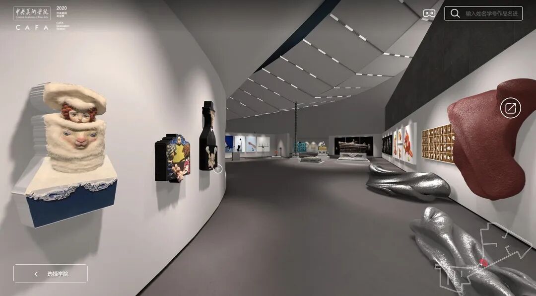 如策划团队提到,“在学校美院美术馆里展出作品是大家觉得温暖和回归的地方,让学生们能够在虚拟的央美美术馆展览作品,对毕业生来说也是非常值得纪念的事情。”区别于纯粹去营造一个纯虚拟的空间,而要让人既感受到虚拟空间的“游览”感,又感受到美院的氛围和形象,而绝非提供冷冰冰的技术,更是将情感和思考融入其中。细节之处皆可见策划团队和技术团队思考的点滴。