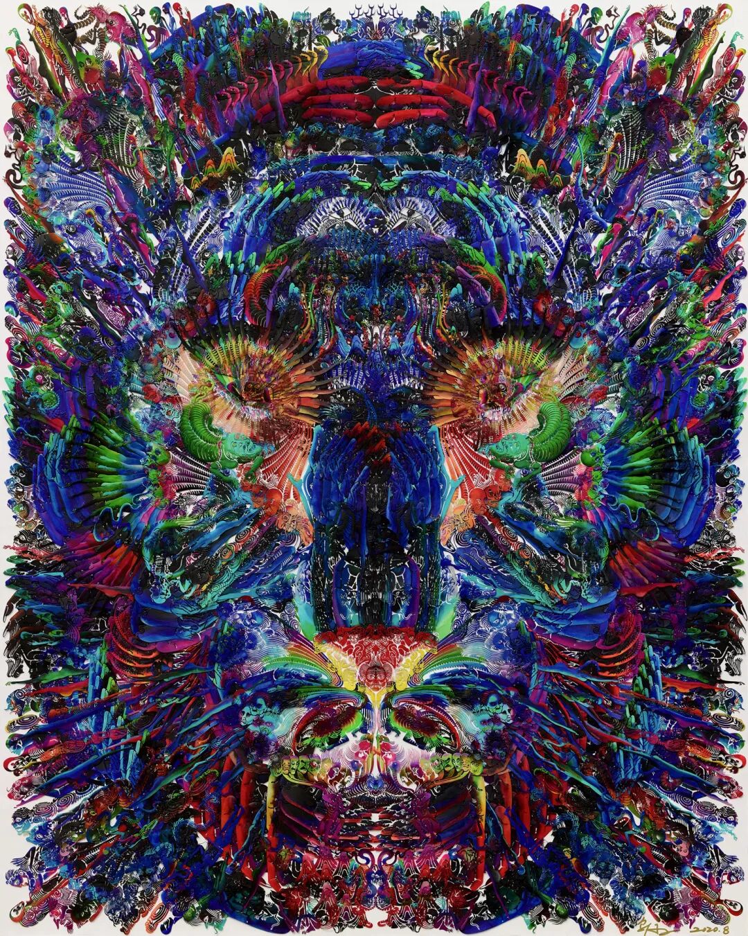 Wu takes the elements that make up Seven Layered Shells as his “alphabet” to create this new Incarnation series. In these new works, thousands of miniature images are overlaid upon each other to create a complex and magnificent visual texture. Seven Layered Shells is a metaphor of certain social values: Only when an individual finds his perfect absolute position can the whole be perfect as a result. In the Incarnation series, however, Wu attempts to break this formulaic relationship between the individual and the collective: The individual coalesces within a condensed and chaotic intertwining formation to an ambiguous ensemble, whose colorful liveliness extends beyond any pre-destination, but rather growth of a self-determined individual. In its current iteration, Incarnation constructs the world of Da Yu ( Yu the Great) taming the devastating flood. At the center of the wall is Da Yu ( Yu the Great), flanked by heroes defeating monsters derived from ancient Greek mythology. The tigers on either wall represent day and night and hinting at celestial movement: time hops around like powerful tigers. The embodiment of time or heroes are both made up of countless fragments from mythology and tales. These are the tools by which we perceive the world.