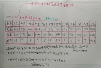 第一天上午的主课,我简单回顾了新冠肺炎的传播,从武汉开始,波及全国,又蔓延到全世界。我们画了一张表格,把国内感染者人数最多的12个省份和直辖市的确诊病例写在上面,我故意打乱前后顺序,让孩子们自己排列,哪个省份感染者最少,哪个最多。