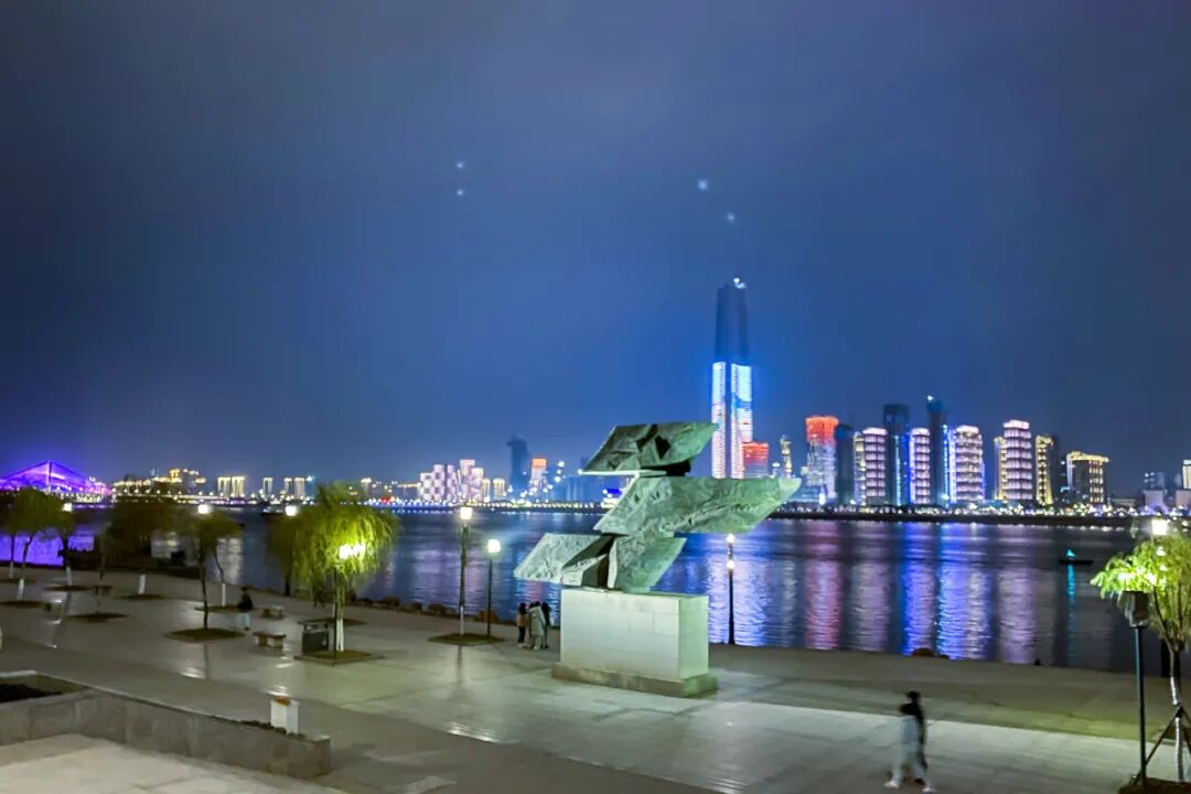 入夜,我们徜徉在汉江江滩,任江风吹乱我们的头发,冷吗?不冷。江水五光十色,倒影斑斓,有如打翻了调色板。