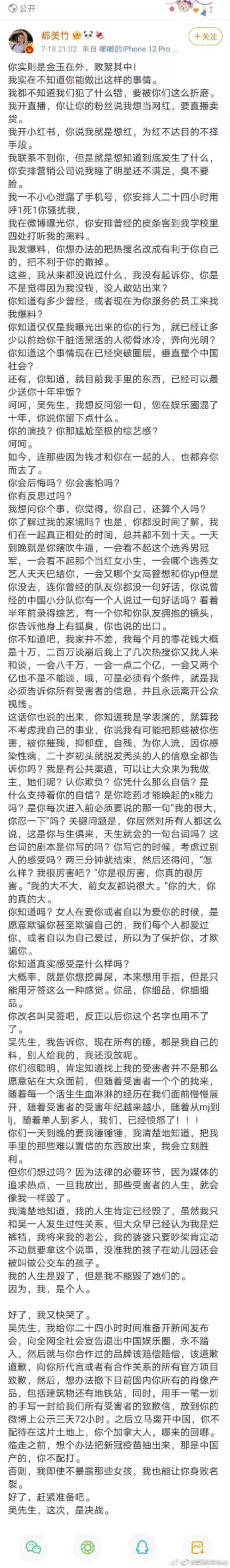 7月18日,都姑娘微博发起“决战”书,要求吴亦凡24小时内召开新闻发布会,向全网全社会宣告退出中国娱乐圈,解除所有商业合同,并手写道歉信向所有受害者道歉,还要他在微博公示道歉信72小时,小姑娘战斗力可谓爆表。