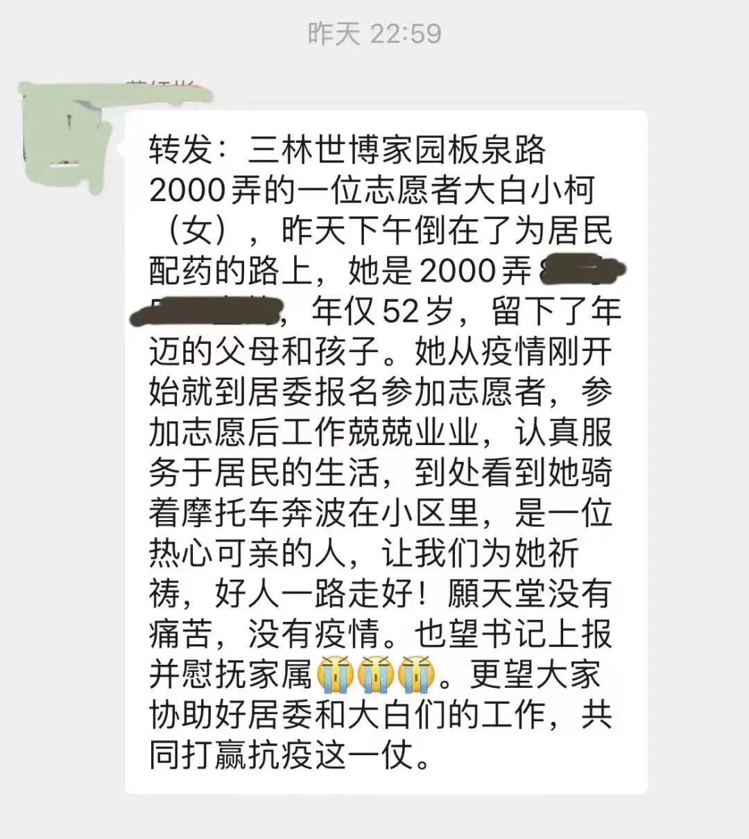 就在我写这篇文章的时候,我的一位朋友给我转来一篇文章,说的是浦东三林的一位志愿者大姐,倒在了为居民配药的路上。她的名字,好像叫小柯。出事两天了,媒体上、微博上,没有任何关于她的消息,我真希望这不是真的。她究竟是怎么倒下的,社区有什么说法吗?政府有没有对志愿者经济和生命方面的保障呢?我知道有志愿者感染新冠的情况,也有一些志愿者已经被单位裁员而失去了日常的收入来源,难道要让他们流汗又流泪吗?如果这是真的,希望更多人通过此文知道小柯,并可以为她的家庭提供帮助,也通过此文了解更多默默无闻的“大白”和“小蓝”,以及许许多多一直奔跑着、行动者的志愿者们……