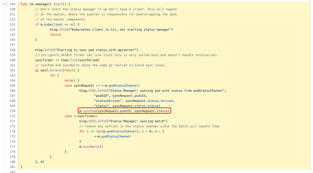 状态管理器在与 apiserver 进行状态同步的时候会去调用该管理器下面的 syncPod 方法进行处理,代码位于 https://github.com/kubernetes/kubernetes/blob/v1.22.8/pkg/kubelet/status/status_manager.go#L149-L181,如下所示: