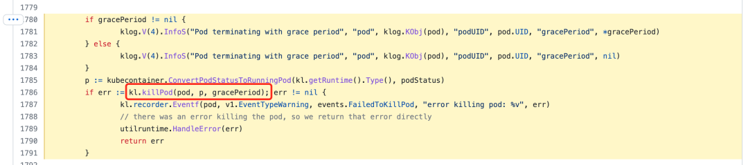 killPod 函数中会调用容器运行时去停止该 Pod 中的容器,代码位于https://github.com/kubernetes/kubernetes/blob/v1.22.8/pkg/kubelet/kubelet_pods.go#L856-L868: