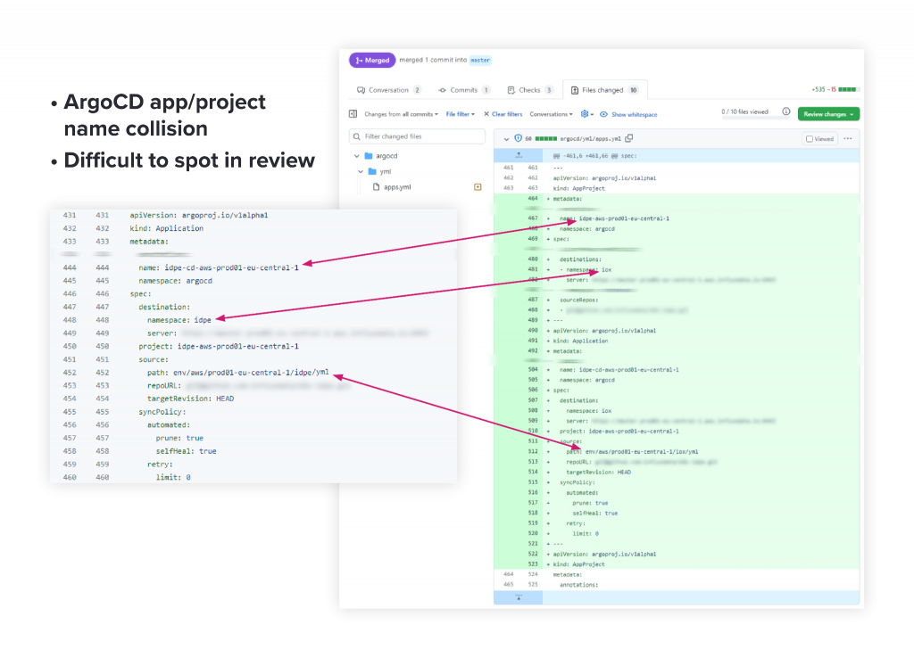 我们立即着手解决问题,首先查看合并 PR 中的代码。这个问题很难被发现,因为它涉及项目和应用程序名称之间的 ArgoCD 冲突。