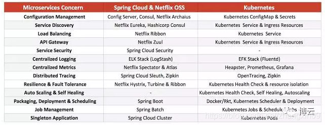 可以看到,里面差不多一半关注点是和运维相关的。这么看来,似乎拿spring cloud和kubernetes比较有点不公平,spring cloud只是一个开发框架,对于应用如何部署和调度是无能为力的,而kubernetes是一个运维平台。